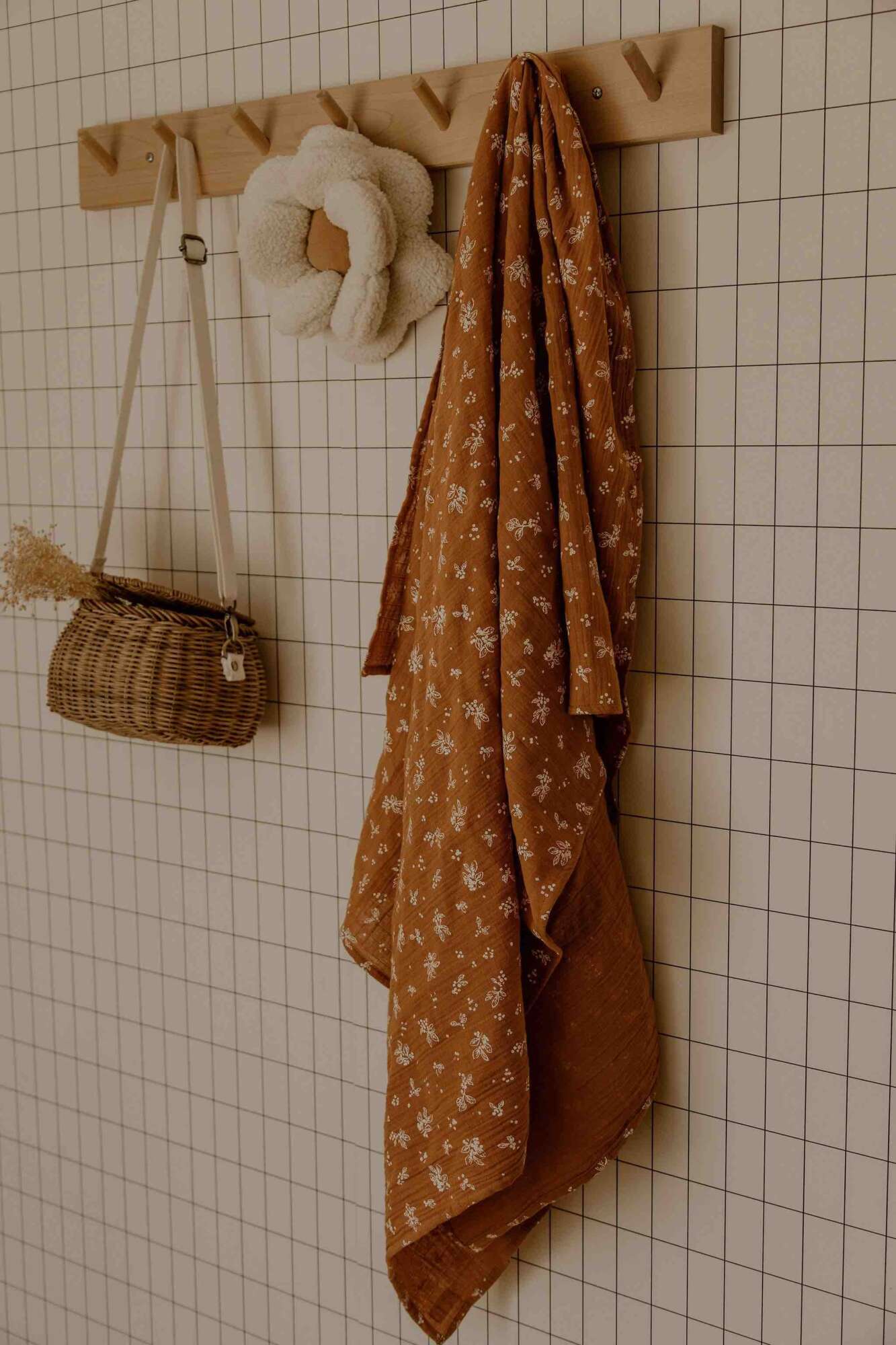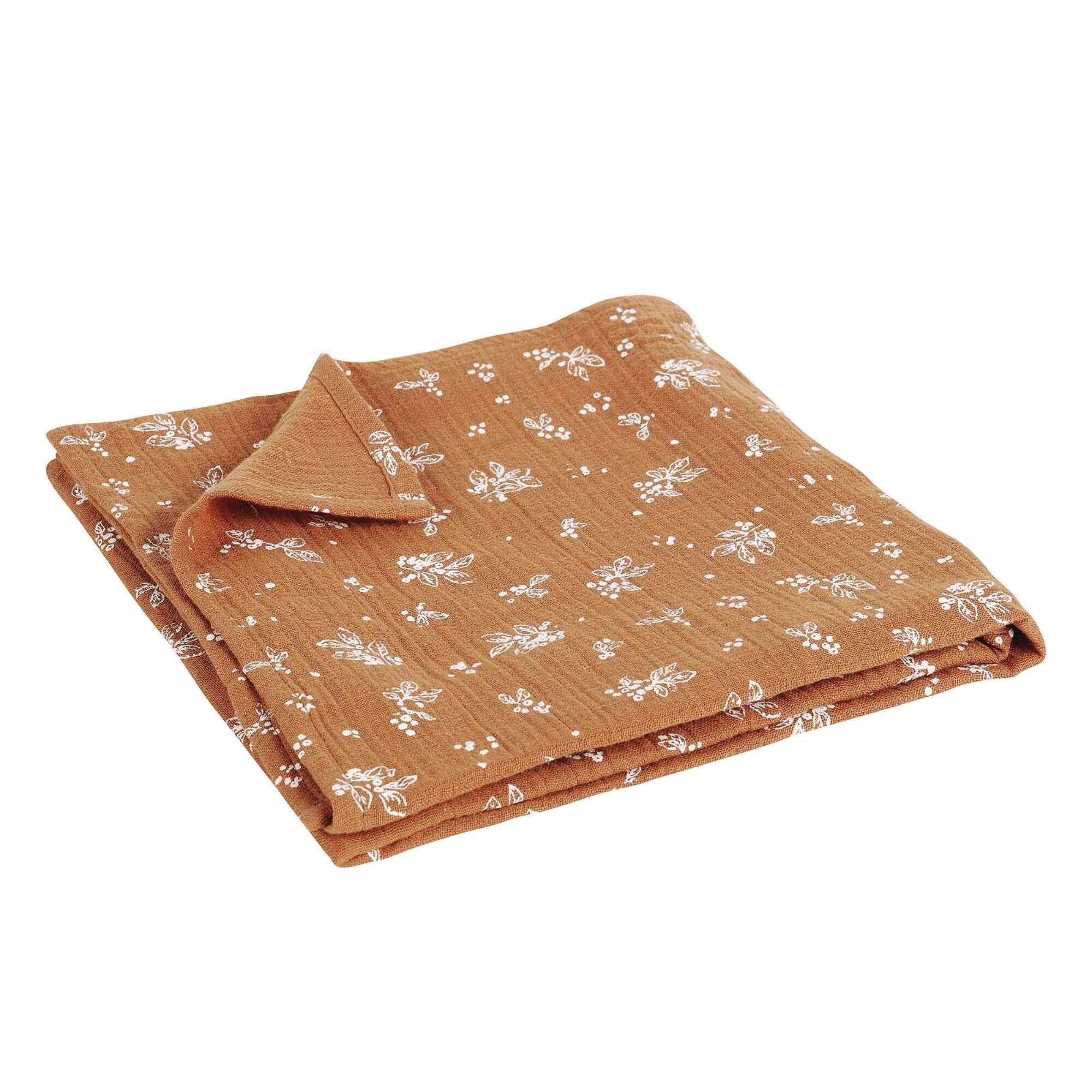 Op de bruine tetradoek staat een fijne, witte bloemenprint (Vegetal Nut). De swaddle is gemaakt uit een dubbele laag tetra, wat zorgt voor extra stevigheid. Tetra is een ademende stof, dun, neemt gemakkelijk vocht op & droogt heel snel!