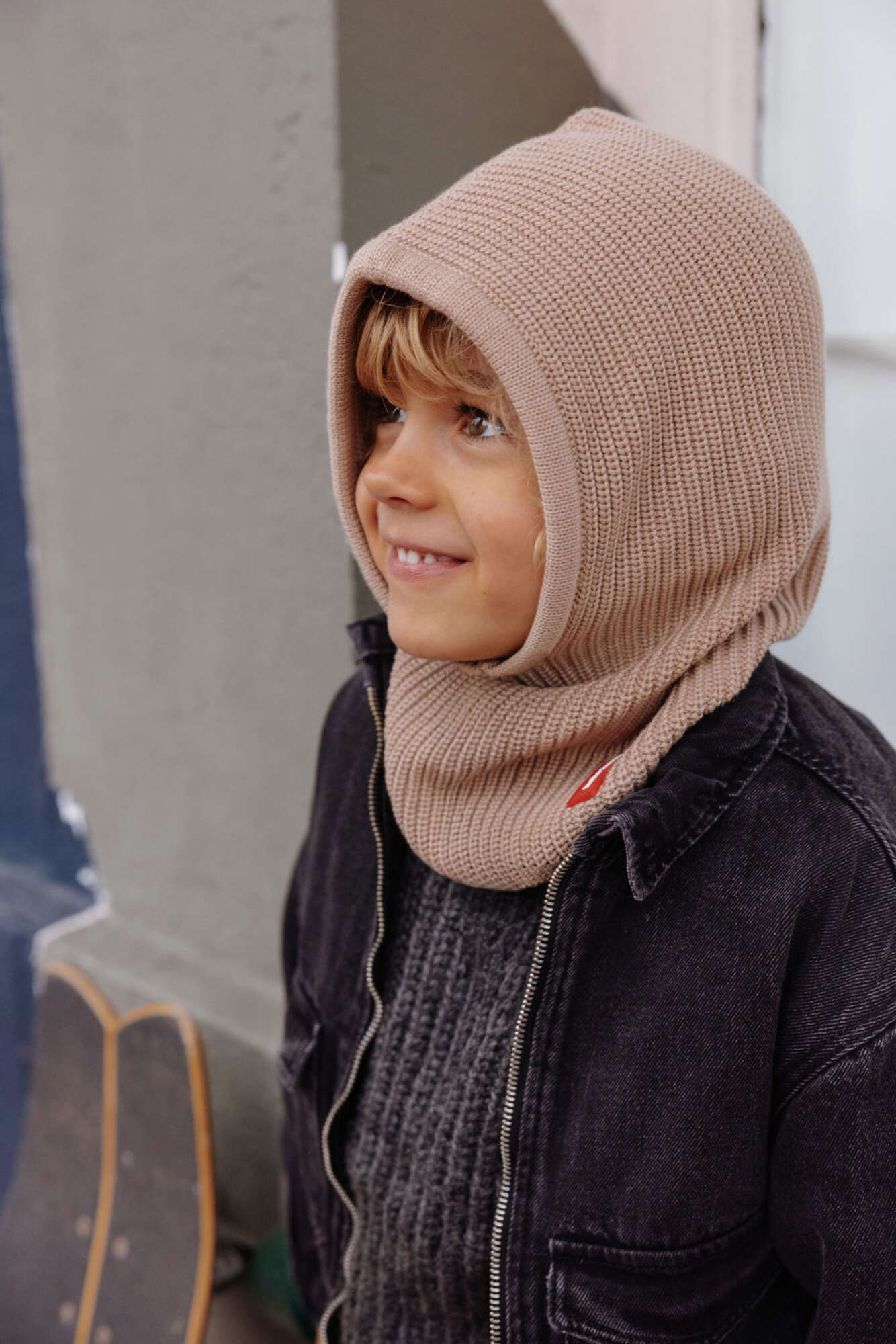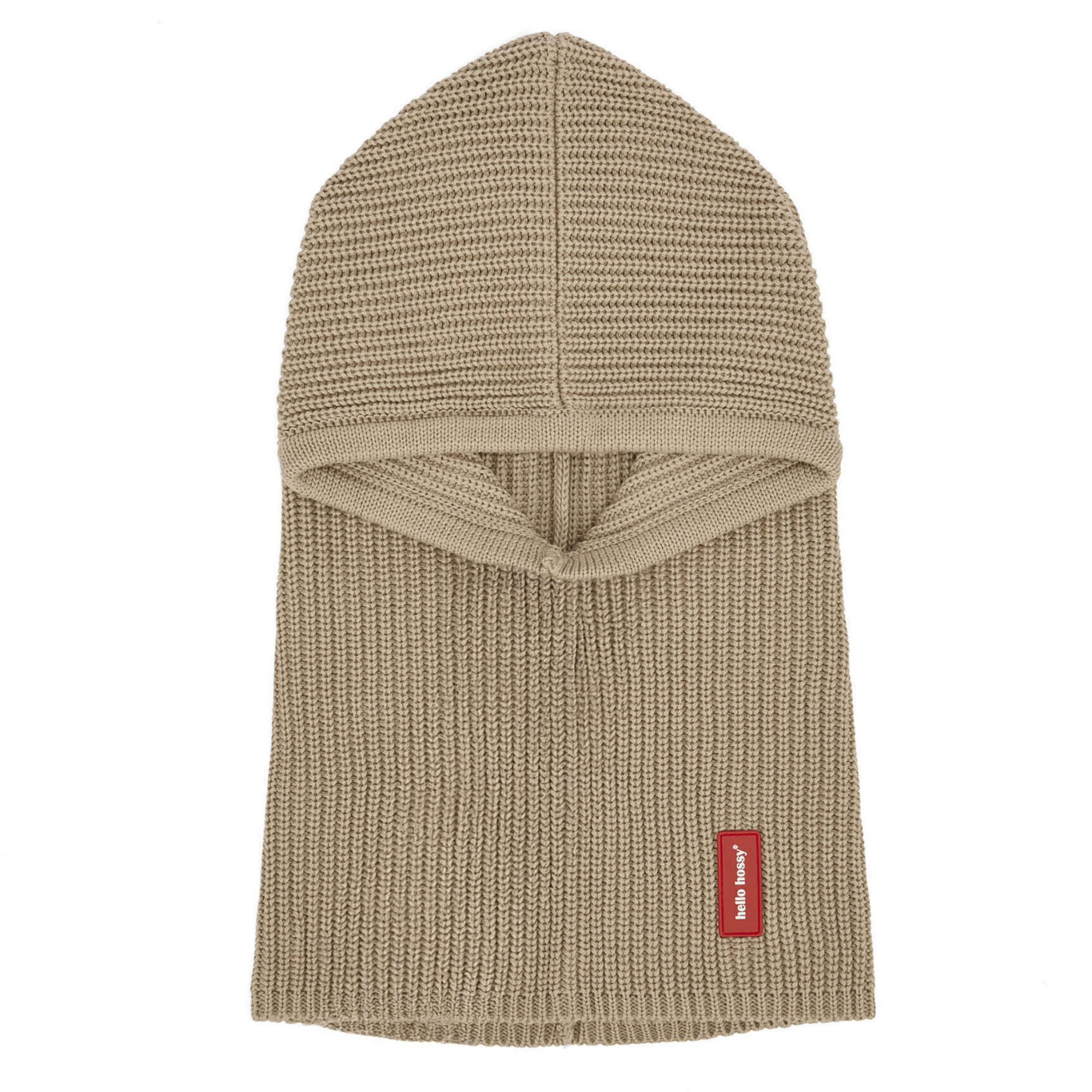 Hello Hossy Cagoule Hoody Latte, een warme en praktische bivakmuts voor kinderen. Deze gebreide beige / lichtbruine wintermuts heeft een neutrale kleur 'Latte'. Een bivakmuts, ook wel balaclava genoemd, biedt heel wat voordelen voor kinderen. Deze muts bedekt het hoofd, de oren, de nek en vaak een deel van het gezicht, wat ideaal is voor kinderen die vaak buiten spelen in de winter. Maar kinderen zijn vaak in beweging en trekken sjaals of mutsen snel af. Een bivaksmuts zit strak en blijft goed op zijn plek waardoor je kleintje geen koud krijgt. Win win!