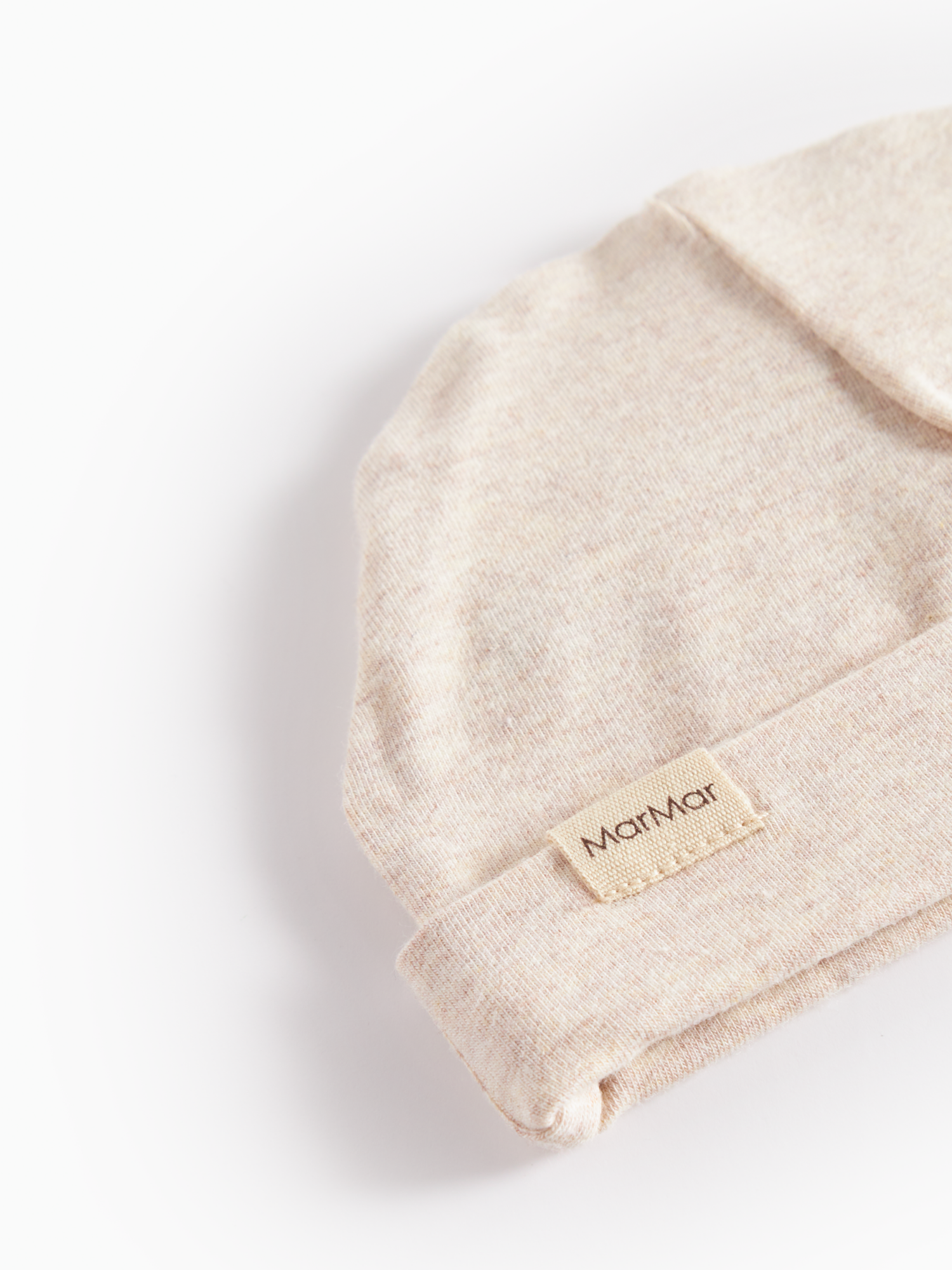 Aiko Newborn babymutsje 'Light Beige Melange' van MarMar Copenhagen. Een effen & neutraal licht beige babymutsje voor pasgeboren baby jongens & meisjes in maat 50 & maat 56. Het mutsje voelt heerlijk zacht aan op de gevoelige babyhuid door een mix van bio katoen met tencel modal*.