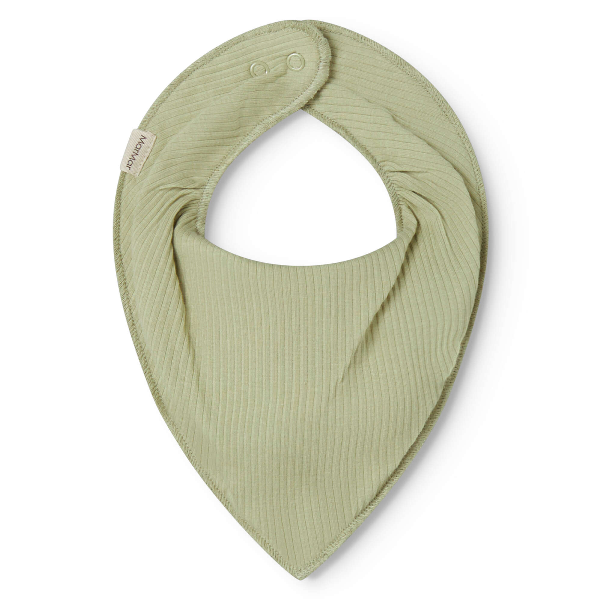MarMar Copenhagen baby slabbetje 'Dried Bay'. Een effen groen slabbetje met fijne rib en gemaakt uit een dubbele laag stof. De slab voelt zijdezacht aan door een mix van modal & organic cotton. Achteraan sluit je de MarMar slabben met een drukknoop (2 maten instelbaar). Vooraan vallen de slabbetjes wat los & nonchalant voor een speelse look. Je baby kan een MarMar slabbetje gebruiken wanneer men tandjes krijgt, tijdens het spelen en vaak kwijlt. Door een grote variatie in kleuren kan een MarMar kwijlslabbetje gematcht worden bij elke outfit.